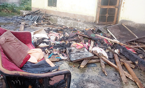 दो मंजिला स्लेटपोश मकान शिवी देवी पत्नी जगदीश शर्मा का है और दुर्घटना के समय बुजुर्ग महिला मकान में अकेली थी। बता दें कि दो मंजिला स्लेटपोश मकान की ऊपरी मंजिल में आग लगने से मकान में रखा सारा सामान जलकर राख हो गया है।